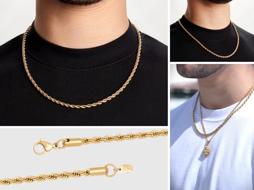 If direction and purpose are significant themes, our gold compass necklace serves as an excellent choice. The sleek and refined design complements a gold rope chain, offering men the opportunity to craft a striking layered look or to wear it as a standalone statement piece. Meanwhile, our collection of gold pendant necklaces provides understated yet distinctive choices suitable for everyday wear.