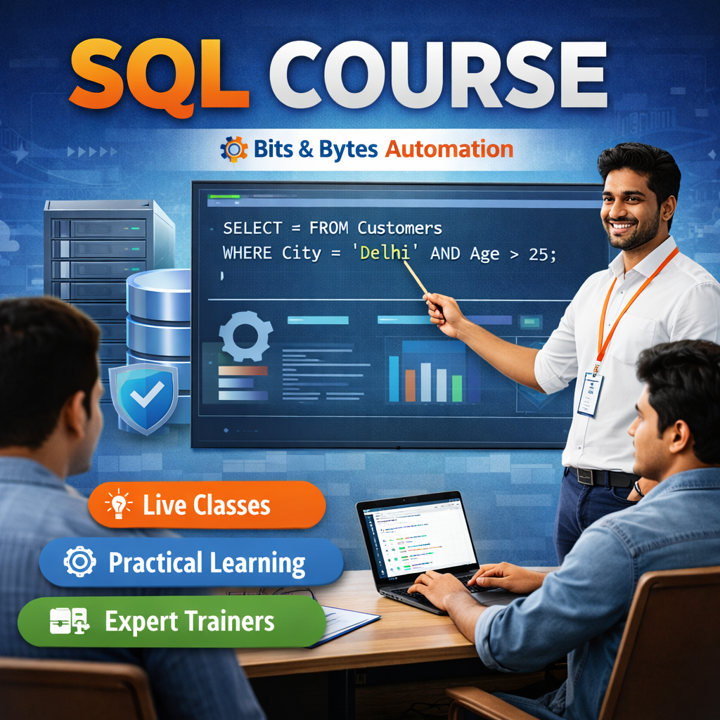 Need to develop a solid database management? Enroll the SQL Server Course in Noida at Bits and Bytes Automation a reputed training institute of more than 11+ years experience in professional IT training. The course is perfect to those students, freshers, and employed workers who wish to acquire some knowledge in database and further their careers in data and software fields. The training includes the basics of SQL server, database design, queries, stored procedures, functions, performance tuning and real time database management.