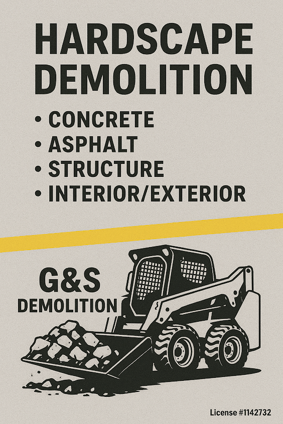 G&S Demolition is a trusted, professional demolition company dedicated to delivering safe, efficient, and cost-effective solutions for residential, commercial, and industrial projects. With a strong reputation built through our sister company, G&S Junk Removal, we bring the same commitment to reliability, customer satisfaction, and attention to detail to every demolition job. Our experienced team specializes in interior and exterior demolition, site clearing, concrete removal, and structural tear-downs, using modern equipment and industry-best practices to ensure safety and precision. Whether preparing a site for new construction or removing unwanted structures, G&S Demolition provides comprehensive services tailored to meet client needs on time and within budget. We pride ourselves on excellence, integrity, and building lasting partnerships through quality workmanship.